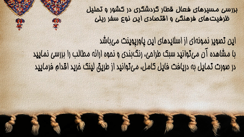 پاورپوینت کامل بررسی مسیرهای فعال قطار گردشگری در کشور و تحلیل ظرفیتهای فرهنگی و اقتصادی این نوع سفر ریلی