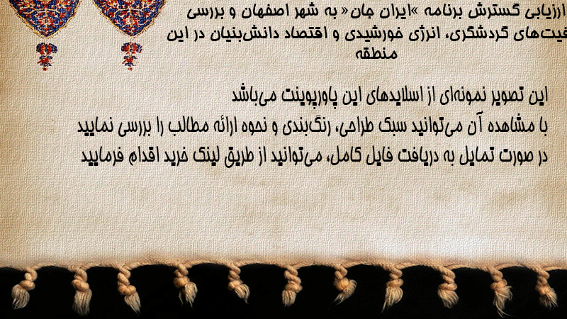 پاورپوینت کامل ارزیابی گسترش برنامه «ایران جان» به شهر اصفهان و بررسی ظرفیتهای گردشگری، انرژی خورشیدی و اقتصاد دانشبنیان در این منطقه