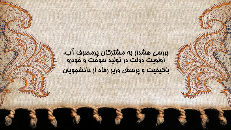 پاورپوینت کامل بررسی هشدار به مشترکان پرمصرف آب، اولویت دولت در تولید سوخت و خودرو باکیفیت و پرسش وزیر رفاه از دانشجویان