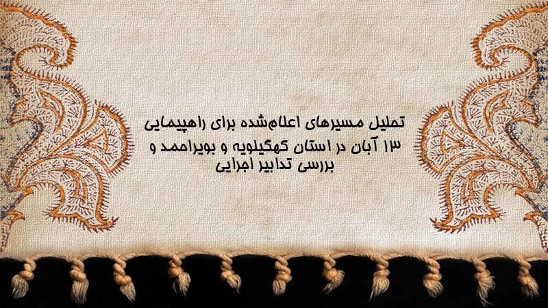 پاورپوینت کامل تحلیل مسیرهای اعلامشده برای راهپیمایی ۱۳ آبان در استان کهگیلویه و بویراحمد و بررسی تدابیر اجرایی