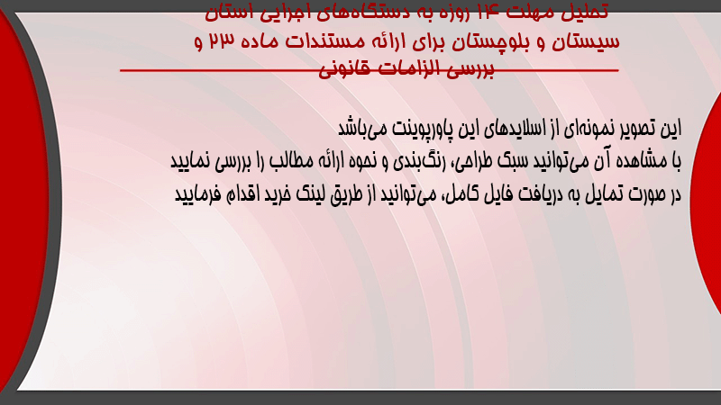 پاورپوینت کامل تحلیل مهلت ۱۴ روزه به دستگاههای اجرایی استان سیستان و بلوچستان برای ارائه مستندات ماده ۲۳ و بررسی الزامات قانونی