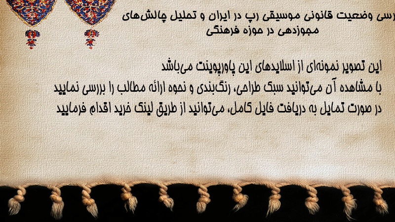 پاورپوینت کامل بررسی وضعیت قانونی موسیقی رپ در ایران و تحلیل چالشهای مجوزدهی در حوزه فرهنگی