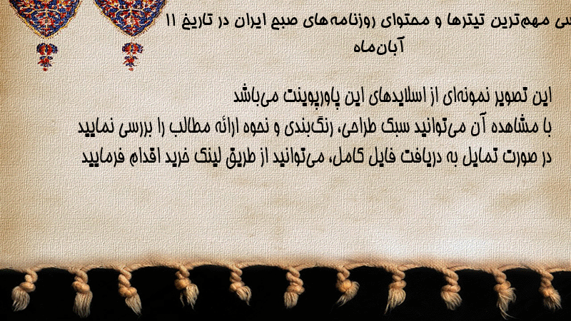 پاورپوینت کامل بررسی مهمترین تیترها و محتوای روزنامههای صبح ایران در تاریخ ۱۱ آبانماه