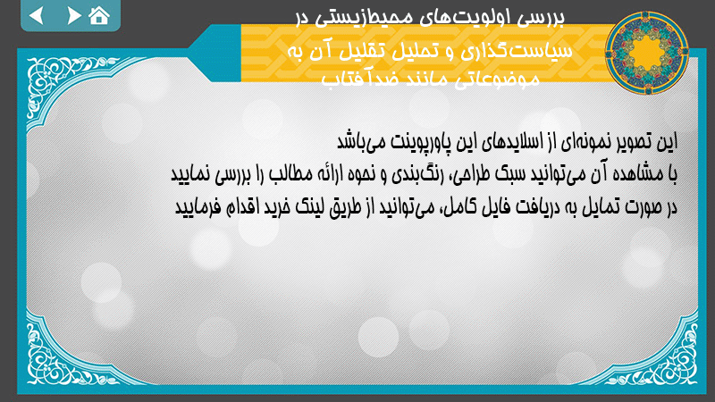 پاورپوینت کامل بررسی اولویتهای محیطزیستی در سیاستگذاری و تحلیل تقلیل آن به موضوعاتی مانند ضدآفتاب