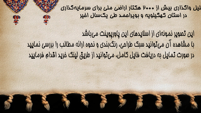 پاورپوینت کامل تحلیل واگذاری بیش از ۲۰۰۰ هکتار اراضی ملی برای سرمایهگذاری در استان کهگیلویه و بویراحمد طی یکسال اخیر