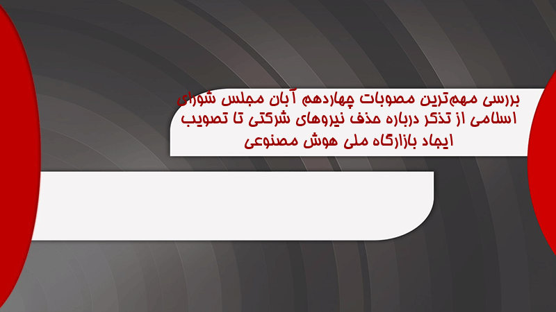 پاورپوینت کامل بررسی مهمترین مصوبات چهاردهم آبان مجلس شورای اسلامی از تذکر درباره حذف نیروهای شرکتی تا تصویب ایجاد بازارگاه ملی هوش مصنوعی