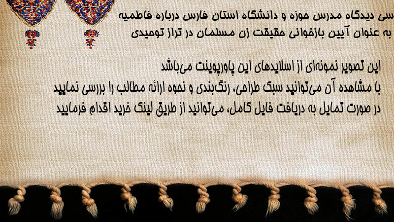 پاورپوینت کامل بررسی دیدگاه مدرس حوزه و دانشگاه استان فارس درباره فاطمیه به عنوان آیین بازخوانی حقیقت زن مسلمان در تراز توحیدی