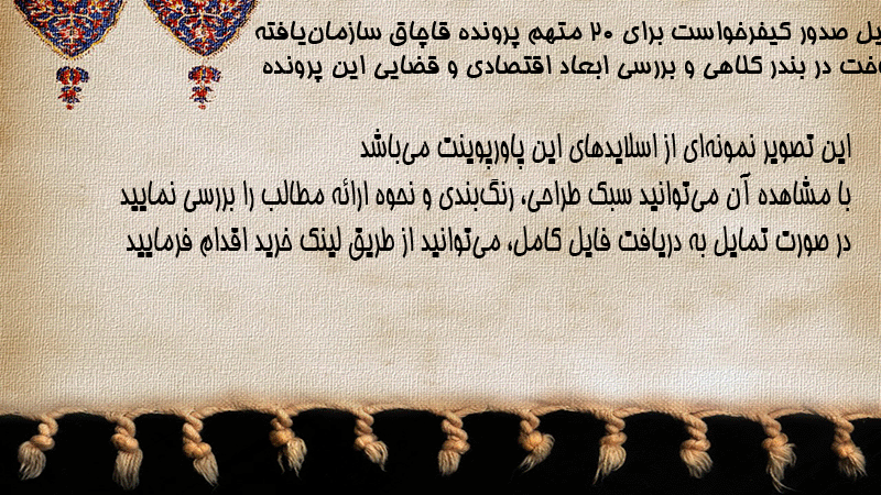 پاورپوینت کامل تحلیل صدور کیفرخواست برای ۲۰ متهم پرونده قاچاق سازمانیافته سوخت در بندر کلاهی و بررسی ابعاد اقتصادی و قضایی این پرونده