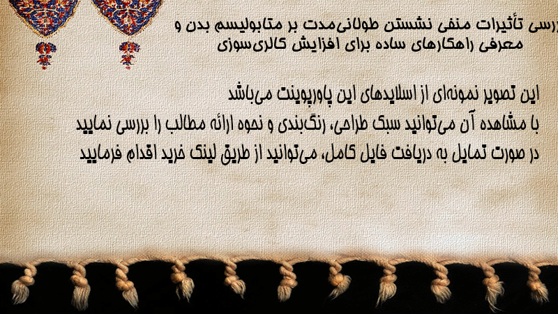 پاورپوینت کامل بررسی تأثیرات منفی نشستن طولانیمدت بر متابولیسم بدن و معرفی راهکارهای ساده برای افزایش کالریسوزی